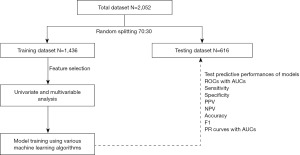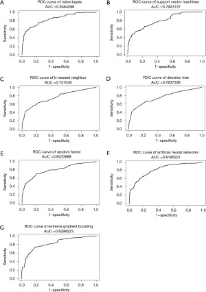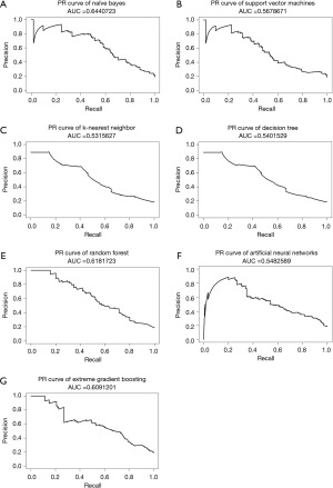 Each algorithm’s performance was measured using sensitivity, specificity, positive predictive value (PPV), negative predictive value (NPV), accuracy, and F1 score. The receiver operating characteristic (ROC) curves with AUCs were also calculated. An AUC of 0.7 indicated acceptable discrimination, 0.8 indicated outstanding discrimination, and 0.9 indicated great discrimination (21). In addition, the imbalanced number of endpoint outcomes is a common problem in clinical research; therefore, precision-recall (PR) curves with AUC and F1 scores have been reported to resolve imbalanced outcomes (22). The AUC of PR curves was used as a comparison metric among ML models. There is no standard cutoff value for the AUC of PR curves. Clearly, the greater the value of PR’s AUC and the closer it is to 1.0, the better. The statistical analysis was performed using the R version 4.4.0 software (R Foundation, Vienna, Austria). Additionally, we constructed web-based applications of various algorithms and deployed them via the shiny platform to validate the ML models in the future (R studio, Boston, MA, USA).