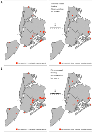 Results: We identify specific areas in the city where flood exposure and hazard sensitivity are high and access to adaptive capacity resources is low. These locations are defined as high flood-vulnerable areas. Within the high flood-vulnerable areas, there are differences in the size of hazard-sensitive group populations (Hispanic poor, Asian immigrant, elderly living in high-rise buildings, and African American low-income).