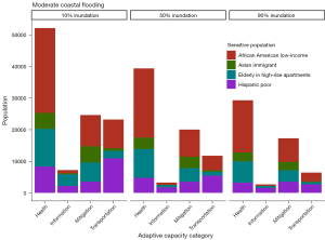 In our analysis, we use a social science approach and define vulnerability based on exposure, sensitivity, and adaptive capacity indicators (67). That is, our framework is based on the context under which populations interact with climate change events. Vulnerability is a function of the intensity of the shock, the exposure to the event for the population or infrastructure, the sensitivity of the population (estimated from socioeconomic and political status) exposed to that shock, and the adaptive capacity accessible to communities to avoid or ameliorate the shock (68). In our case, exposure is defined as the number of persons and buildings that are potentially confronted by flooding. We view intensity as the level of flooding, either moderate or extreme based on modeled forecasts. Sensitive populations are identified using socioeconomic variables as proxies for those populations that have reduced capacity to cope with hazards. We refer to this specific form of sensitivity as hazard sensitivity. We base our understanding of this form of sensitivity on research from previous studies. We view adaptive capacities as the collective resources and services that help individuals or communities adjust to actual or expected hazards and their effects, including material or social resources that moderate harm or provide benefits (59). While we provide general categories of adaptive capacity, we do not combine different themes to generate a single value. Rather, we examine the potential effect of each general theme for adaptive capacity on exposed, hazard-sensitive communities separately.