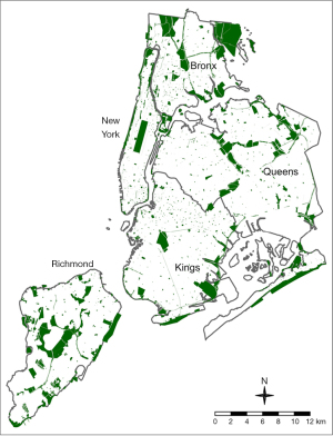Figure 1 New York City counties (also known as boroughs) and park system. Note that Bronx County is also known as The Bronx, Kings County is also known as Brooklyn, New York County is also known as Manhattan and Richmond County is also known as Staten Island.