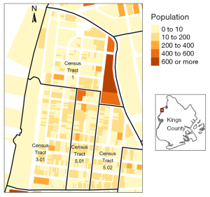 For this study, we developed a set of maps of social vulnerability for flooding by census tract in New York City (Figure 1) that includes two different types of flood exposure (coastal and pluvial) of two different intensities (moderate and extreme), hazard-sensitive populations, and common resource adaptive capacity facilities or services. We used census tracts for the 2020 U.S. Census extracted from the National Historical Geographic Information System (NHGIS) (see https://www.nhgis.org/). The NHGIS provides easy access to summary tables and time series of population, housing, agriculture, and economic data, along with Geographic Information System (GIS)-compatible boundary files, for years from 1790 through the present and for all levels of U.S. Census Bureau geography, including states, counties, tracts, and blocks.