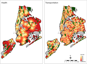 To identify hazard-sensitive populations, we employed a principal components analysis (PCA) that aggregates correlated variables believed to be related to hazard sensitivity. For adaptive capacity, we identified public and common resource facilities and infrastructure or services geographically across the city. The sets of resources were aggregated into four different themes or categories (health, flood mitigation, transport, and information). We identified the distance from each census tract to the location of each service as representing access to the resource. We choose the lowest (or nearest) resource to each census tract in each category to represent a proxy for access to these adaptive capacity resources. For exposure, we used two different sets of spatial datasets that defined the extent of coastal and pluvial flooding in the city. We defined a range of exposures based on the percentage of the building lot that was potentially flooded. This section describes the data used and details the analyses of those data in creating the vulnerability maps.